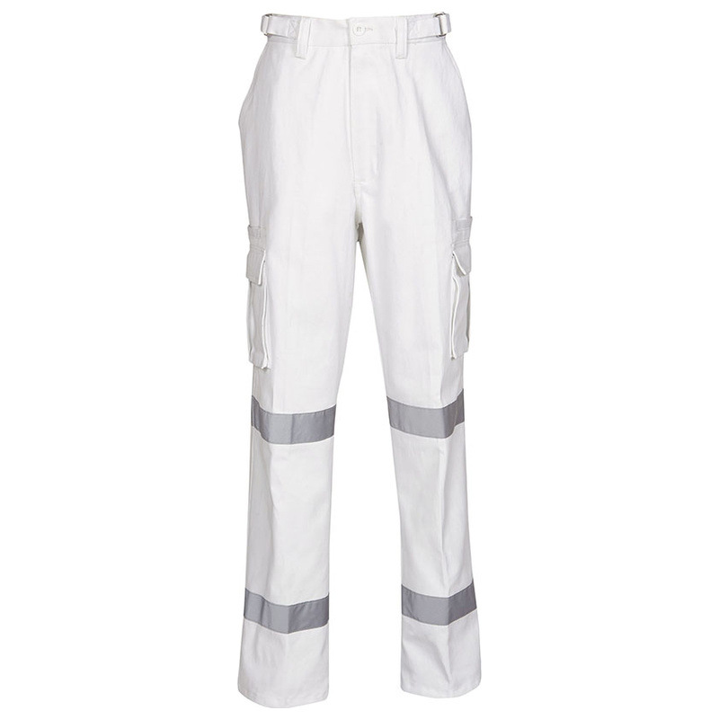 Designed to complement day/night high-visibility workwear, these cargo trousers with reflective tape provide enhanced visibility and durability for demanding environments. Made from heavyweight cotton drill, they feature a comfortable regular fit and multiple functional pockets for practical on-site use. The two loops of 50mm reflective tape improve bio-motion visibility, helping increase safety in low-light conditions. The white colour option is recommended for night use only.